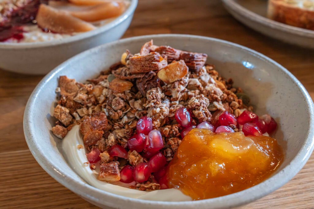 … granola with sumac-roasted plums, yoghurt and pomegranate seeds, and…