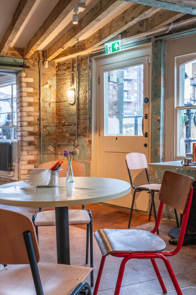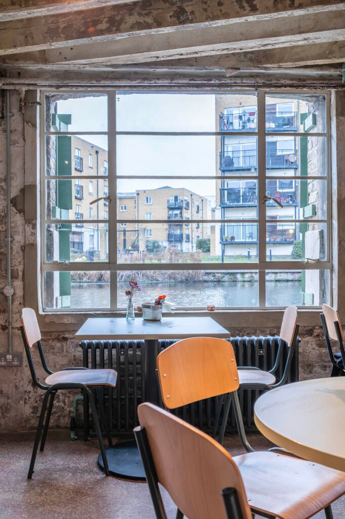 The interior of the cafe isn’t wildly different from its previous incarnation – it’s rustic with exposed beams and brickwork and old layers of peeled paint on the walls. Furniture is simple and the windows are large, offering an excellent view of all of the goings on along the towpath and on the canal outside – from where we sat I watched dogs go by, seagulls swoop over, Canada Geese glide by and a cormorant air out its wings.