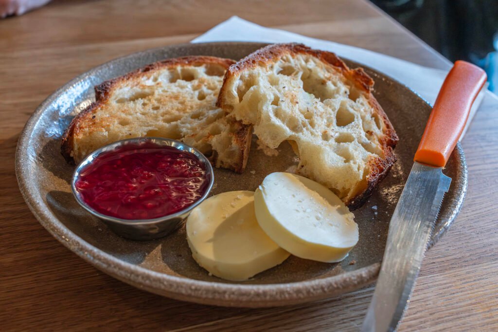 My husband chose to order a variety of small brunch dishes, including toast served with butter and raspberry and rhubarb jam (delicious, albeit tricky to scoop up onto toast – they should sell this if they don’t already, I didn’t see it in the deli section)…