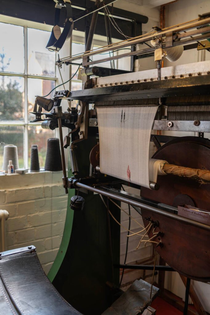 In the second building is a frameshop, housing examples of 18th, 19th and 20th century knitting frames on the ground and first floors. In this building one of the volunteers, Colin, talked us through how the machines worked to produced knitted fabric, who would have been involved in manning the machines and how they lived and worked. After a basic talk through the machines downstairs, he took us to the first floor where we got to sit at a machine and he played an audio track of what just four machines – a small number compared to those that would have been manned and worked – would have sounded like (spoiler alert, it would have been incredibly loud). He also showed us how the frames worked by knitting a row on one of the frames.