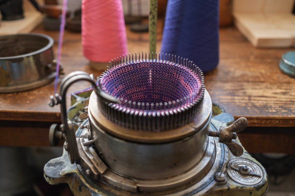 On the first floor are working examples of circular knitting machines, where another volunteer demonstrated how the circular machine worked to create tubes of fabric and how heels and ribbing are created. This is the most interactive past of the museum because it’s here where you can sit down at a machine and actually turn the handle yourself to watch the machine create rows of circular knitting. It’s very hypnotic and calming (and much quieter than the operation of the large frames).