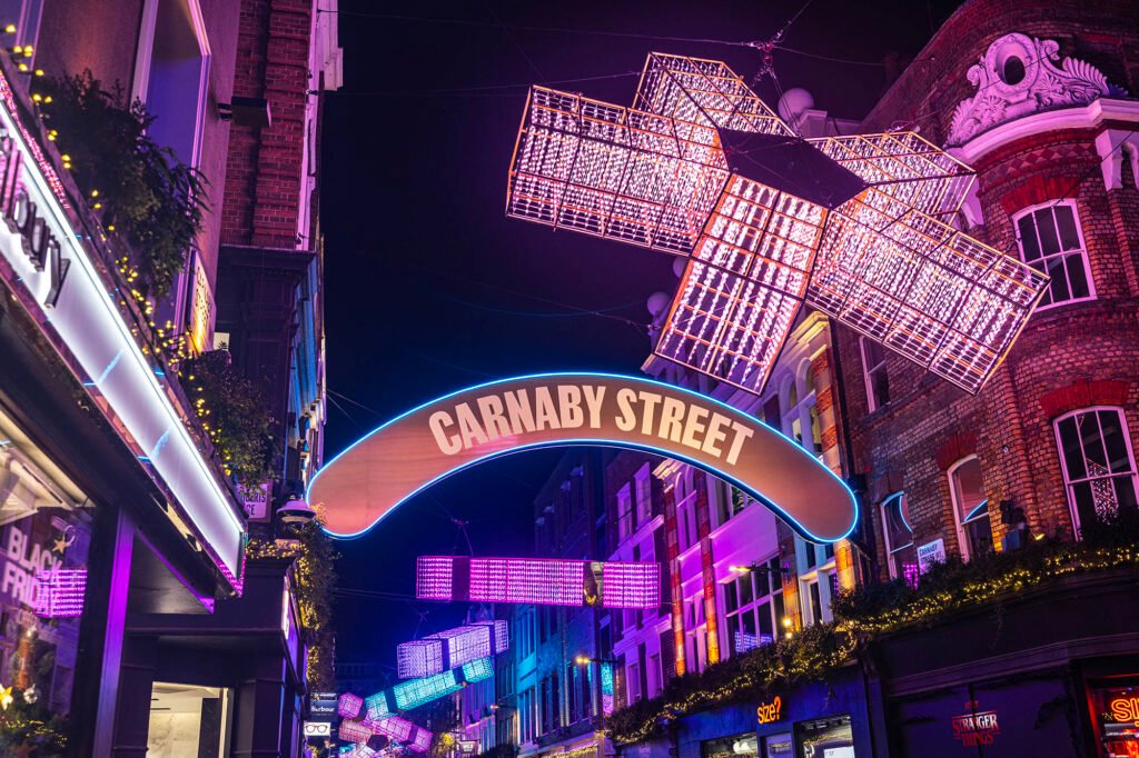Just around the corner, Carnaby Street proved less underwhelming than last year. It features the same decorations from last year (apparently they’re here for a while in an attempt to be eco-friendly) but they’re at least more interesting that last year’s pure white bulbs. This year’s vibe feels more similar to previous years at least in colour, if not style and interest.
