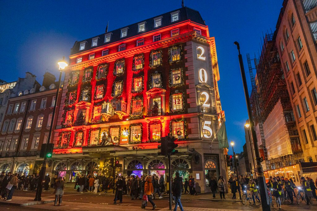 From there we head through the Burlington Arcade, the roof of which was fitted out this year with gorgeous sparkling chandeliers, alternating with decorations depicting the Twelve Days of Christmas gifts (from the Fortnums end you’ll count down, from the North you’ll count up).