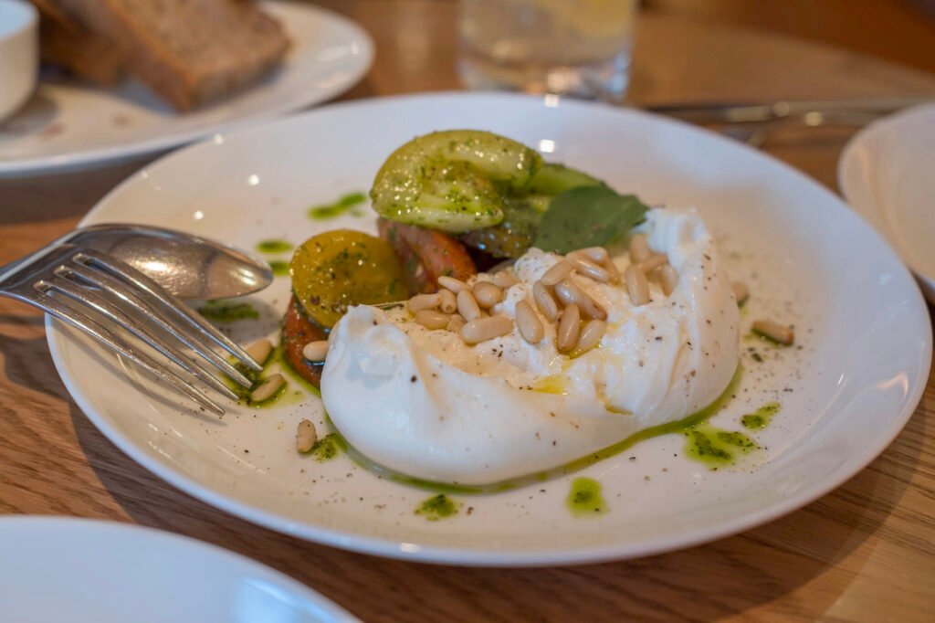 We opted to share a few small plates to start – sourdough with extra virgin olive oil, and a burrata with heritage tomato and pesto: