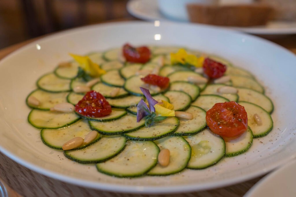 Courgette carpaccio with pine nuts and slow roasted tomatoes (zingy, fresh, summery – perfect for a hot sunny London day):