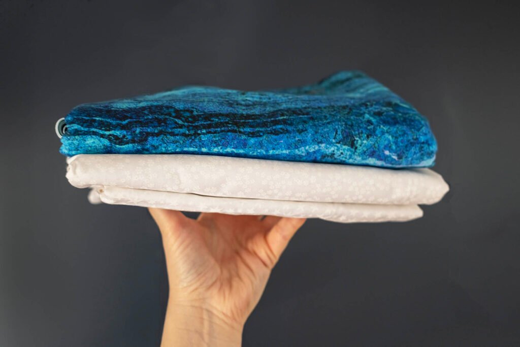 Of course, I needed fabric, which I bought from Sew Hot. To make things as easy as possible I’ve decided to stick with one main fabric, a blue Northcott fabric – Stonehenge – which has a deep to light blue gradient. I also bought a few white on white fabrics to supplement my stash. I like white on white printed fabrics because it adds a bit of depth and interest without the print being too obvious.
