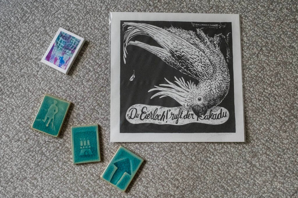 Just around the corner at Druck Dealer (amazing little shop if you are looking for art prints) we picked up a Janta Island print – Du Eierloch ruft der Kakadu. According to Wikipedia: